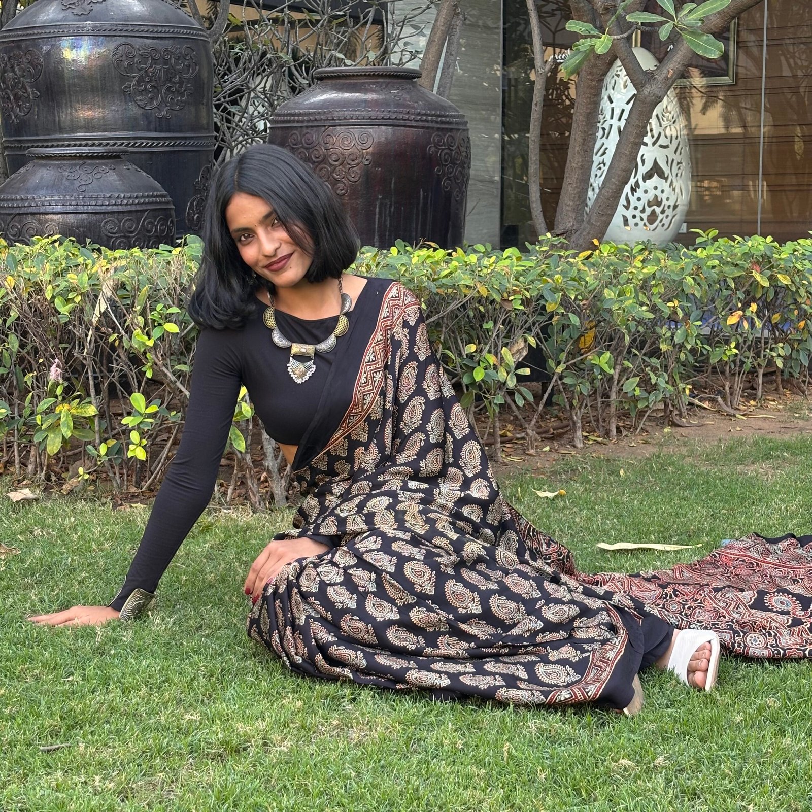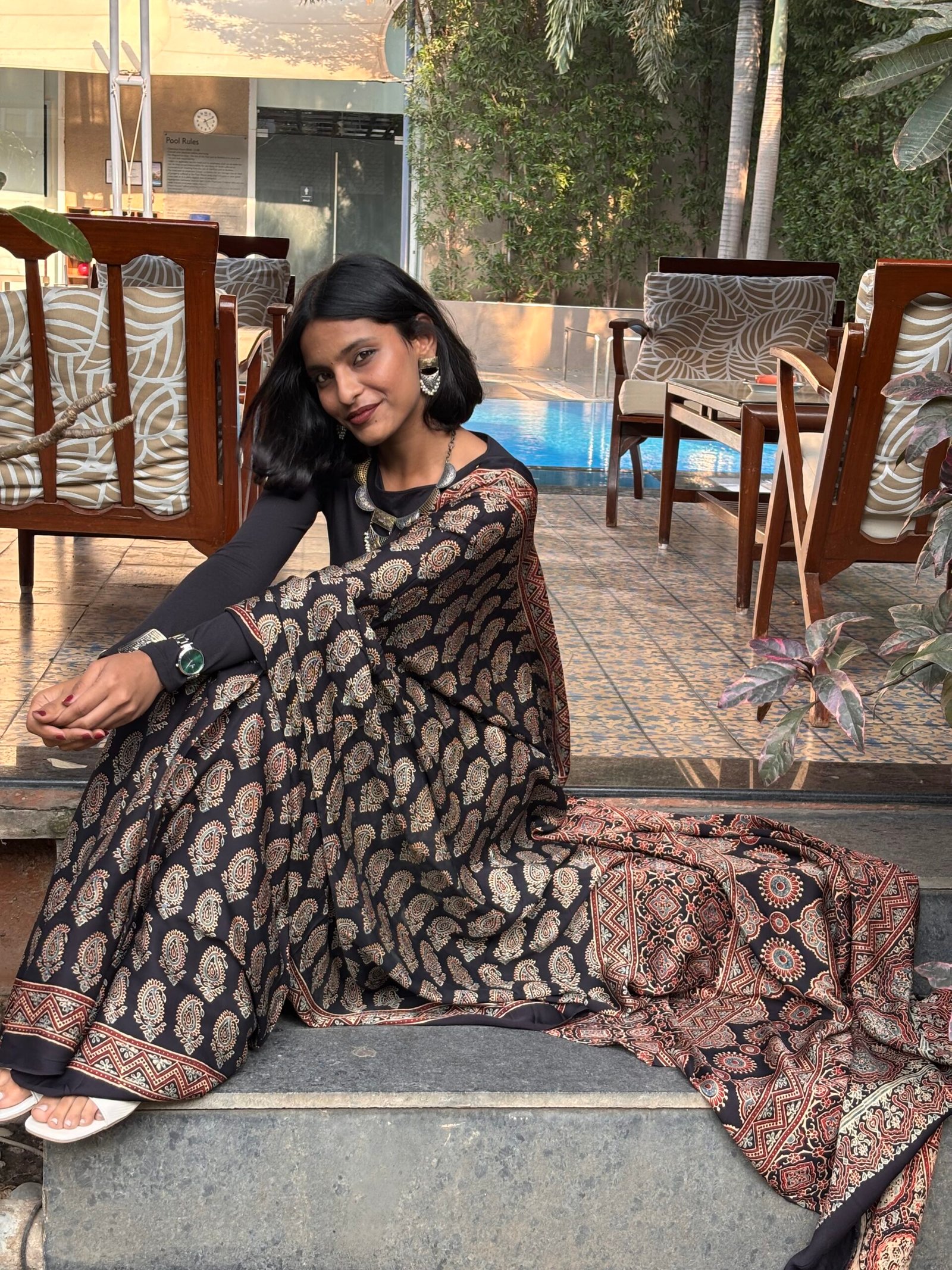 Experience the charm of traditional craftsmanship with our Ajrak Modal Silk Saree, a perfect blend of heritage Ajrakh printing and the luxurious softness of modal silk. Each saree is hand block–printed using natural dyes, bringing alive centuries-old artistry in every motif.