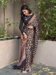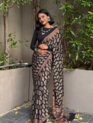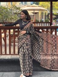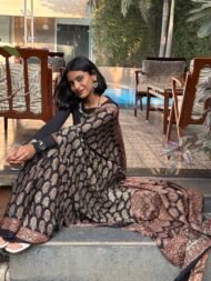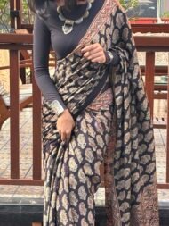 The modal silk fabric gives this saree a rich, fluid drape—lightweight, breathable, and incredibly soft on the skin. Its deep, earthy Ajrak tones and intricate patterns make it a stunning choice for festive wear, cultural events, or elegant everyday styling.